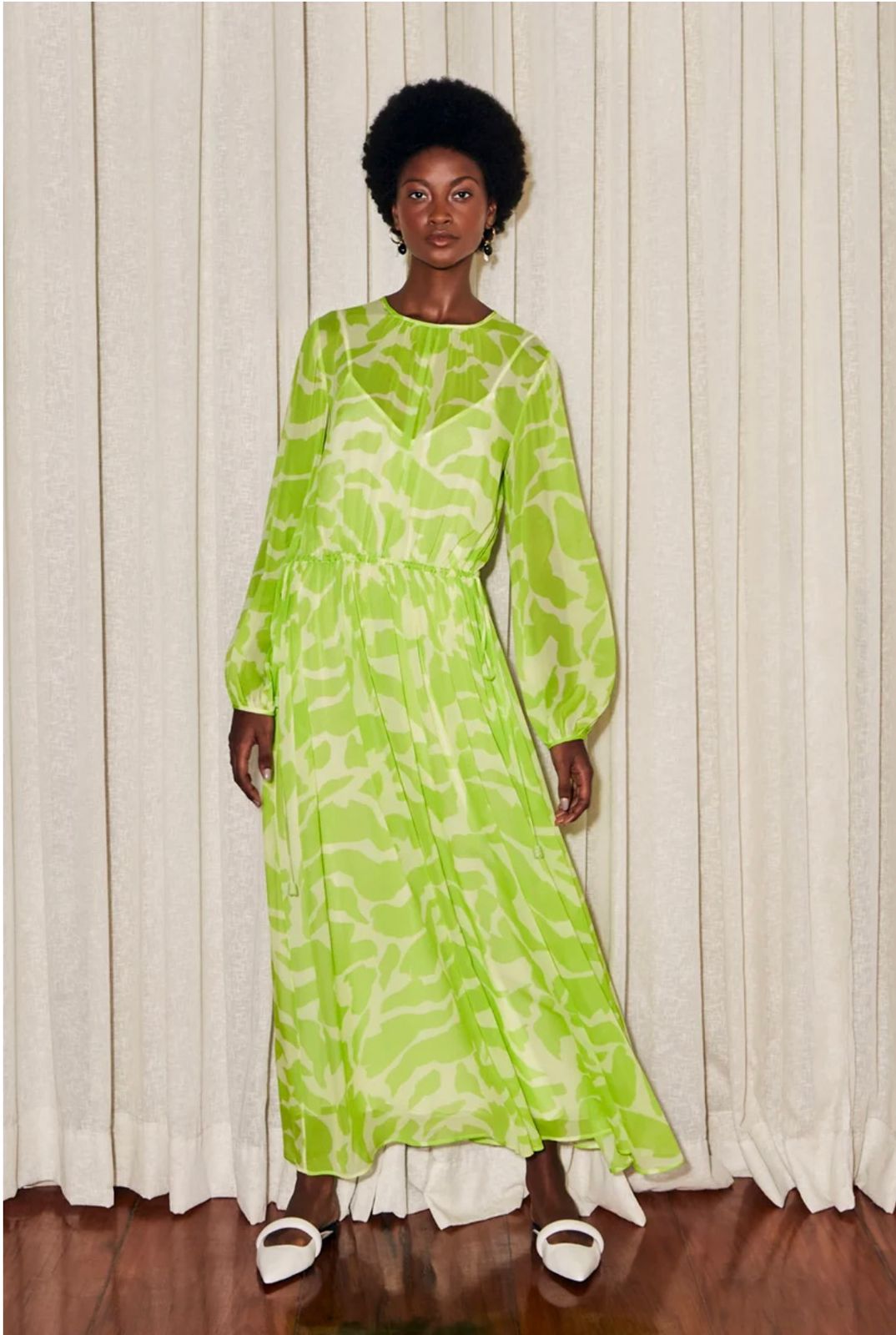 Vestido Andrea Marques Longo Manga Comprida Estampa Verde e Branco Seda